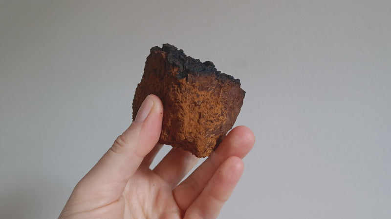Chaga looks unlike most mushrooms. Instead of a recognisable cap and stem, it forms a hard, dark, irregular mass on the outside of birch trees. Its charcoal-like exterior and rust-coloured interior reflect an unusually dense structure, shaped by years of slow growth in harsh environments. This distinctive form is one of the reasons Chaga is often described as a “non-traditional” mushroom.
